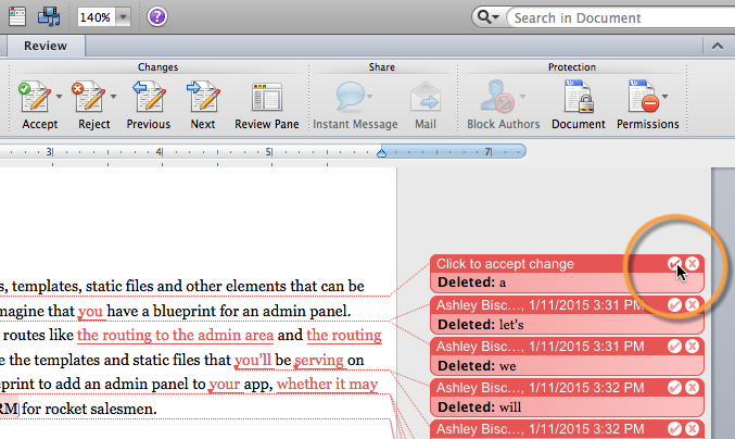 Or if you might prefer, you can also accept or decline changes through the buttons on top of the bubbles surrouding each change. You can click the “✓” button to confirm a change or the “✕” to decline it: